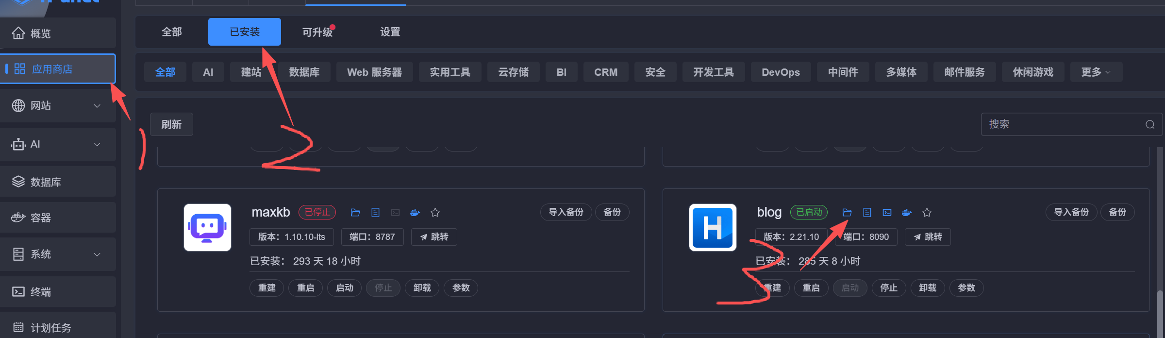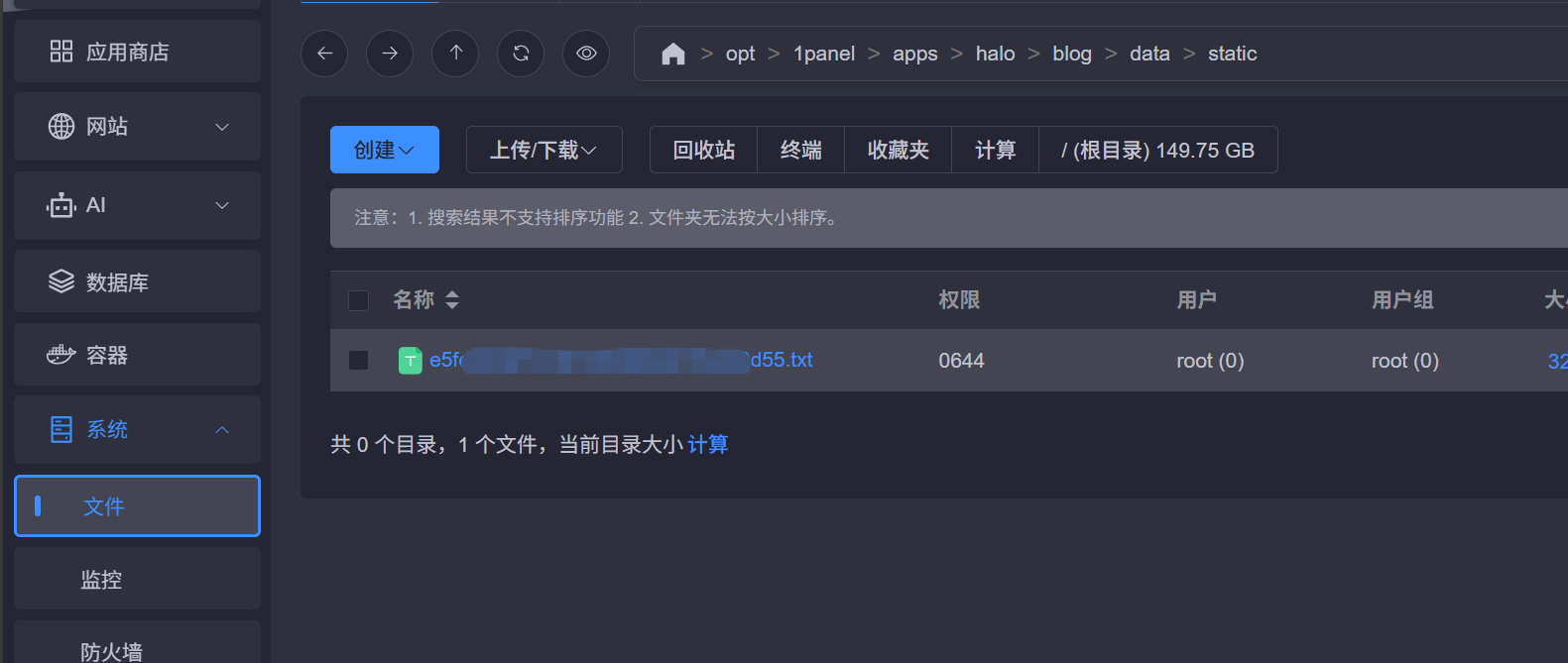 我是使用1Panle直接部署的,在按照下图操作,可直接进入Halo的工作目录中